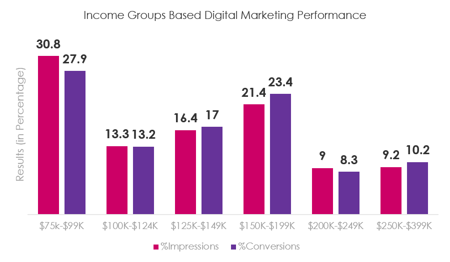 Similarly, household income (HHI) data can help you understand the performance for specific income groups. The chart below shows that the $150K-$199K HHI range performs slightly better when comparing conversions to the percentage of impressions. Understanding these metrics in real time enables proper optimization of campaigns across all your marketing efforts.